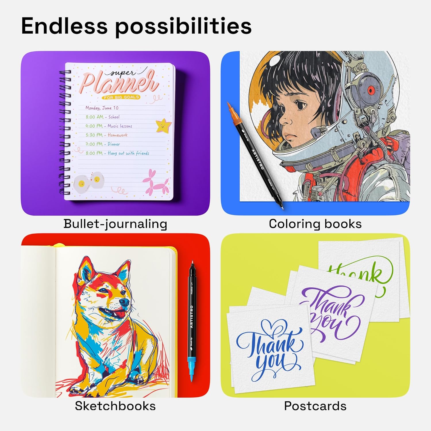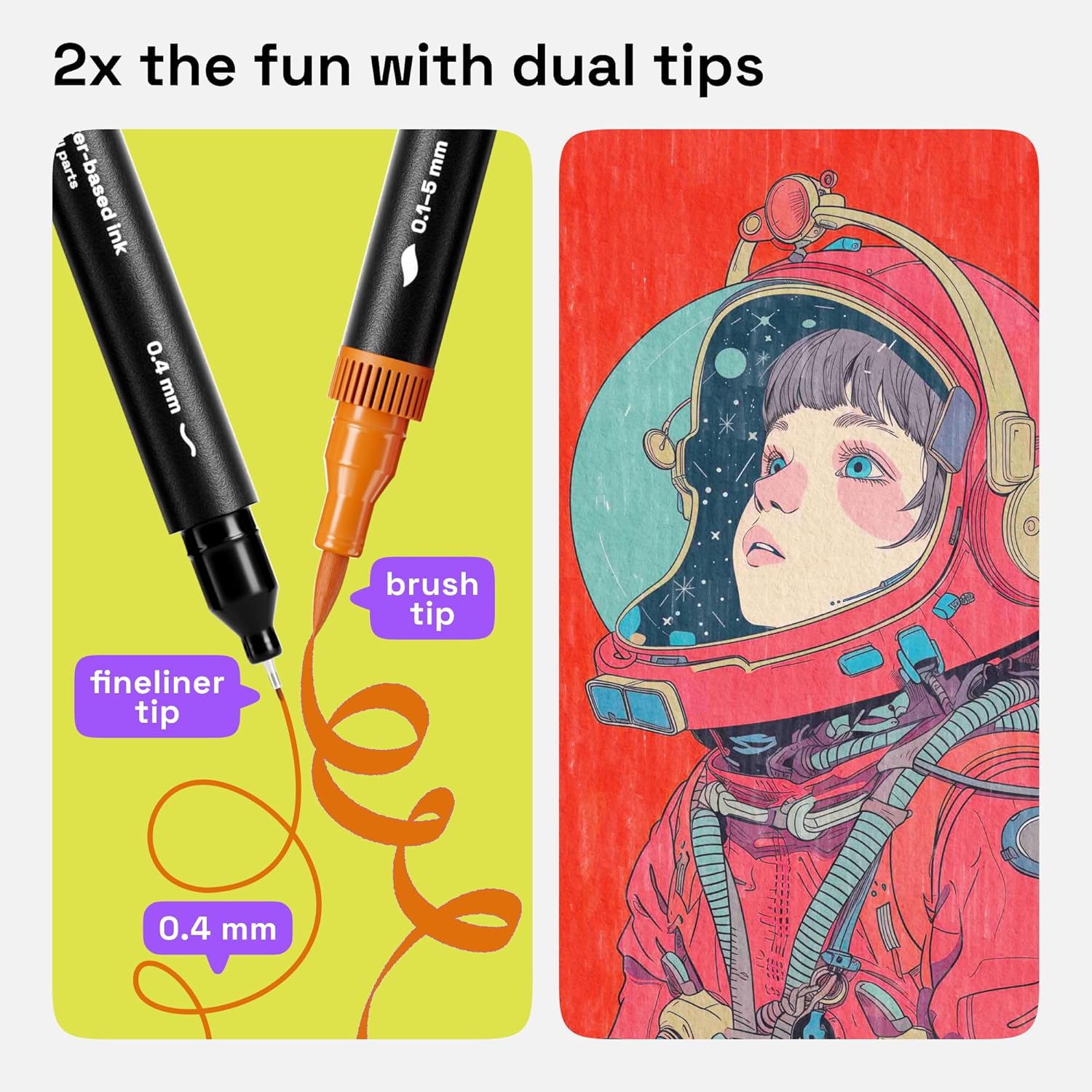 - BRUSH & FINE POINT PENS: Explore endless opportunities with these dual-ended drawing pens. You get 2-in-1 art pens that are both 0.4 mm fine tip pens and dual brush marker pens. These coloring markers are perfect for doodling, coloring, writing, and coloring books.