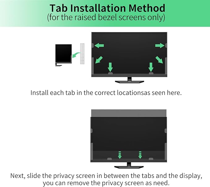 - 【Easy to Install & Reusable】 Our 34 inch privacy screen for monitor has 2 uniquely designed installation methods: ① Permanent installation- double sided adhesive tape. Suitable for all computers with a screen aspect ratio of 21:9 and a size of 34 inches. ② Removable installation- slide mount tab. Suitable for computer with raised frame, you can slide the filter in and out of the screen as needed, it provide a quick and easy way to remove your monitor privacy filter when you don't need.