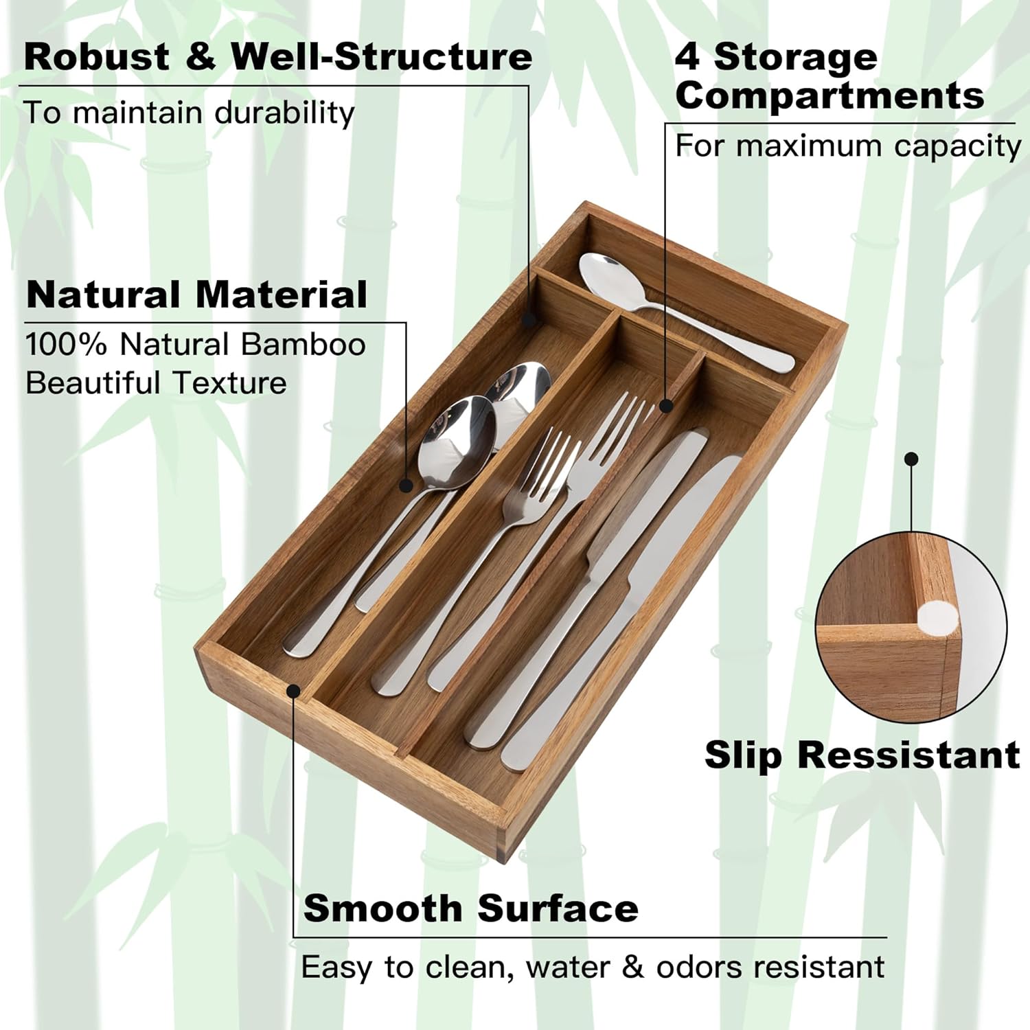 - 【Strong Structures】Our silverware drawer organizer is half manual made, more strong, more delicate. Mortise and tenon structure makes this silverware organizer hold up well. Sturdy dividers and base won’t warp. Excellent craftsmanship and strict quality-strict ensure each drawer dividers is touched with the board tightly, so your kitchen silverware won’t get stuck. The bottom is equipped with premium non-slip pads to keep your organizer in place. Kitchen storage just got a whole lot easier.