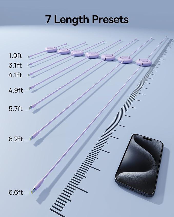 - Longer Length Updated: The 6.6ft Retractable USB C Cable Features a 7-Stage Length Preset, Allowing It to Accommodate Various Charging Scenarios and Ensuring Flexibility no Matter the Distance.