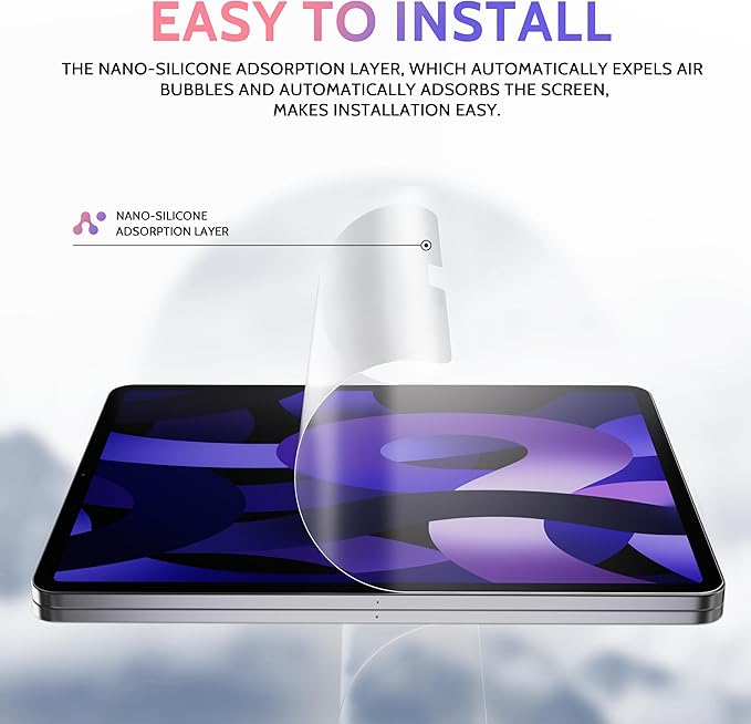 - 【Easy to Install】The Peslv iPad air 10.9 inch screen protector uses a nano-silica gel adsorption layer, which can automatically discharge air bubbles and automatically absorb the screen, which will make our installation very simple and convenient, and there will be no more troubles with air bubbles. The iPad like-paper film has high-quality oleophobic properties and can effectively prevent fingerprints.