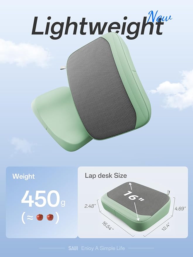 - 【Breathable lap pillow tray 】The surface material of SAIJI's laptop desk is 3D mesh fabric, which can stably support the weight of a laptop without collapsing or deforming, while also not adding significant weight to your legs. Additionally, the three-dimensional structure of the 3D mesh fabric allows for heat dissipation from all sides, ensuring that your laptop stays at an appropriate temperature at all times.