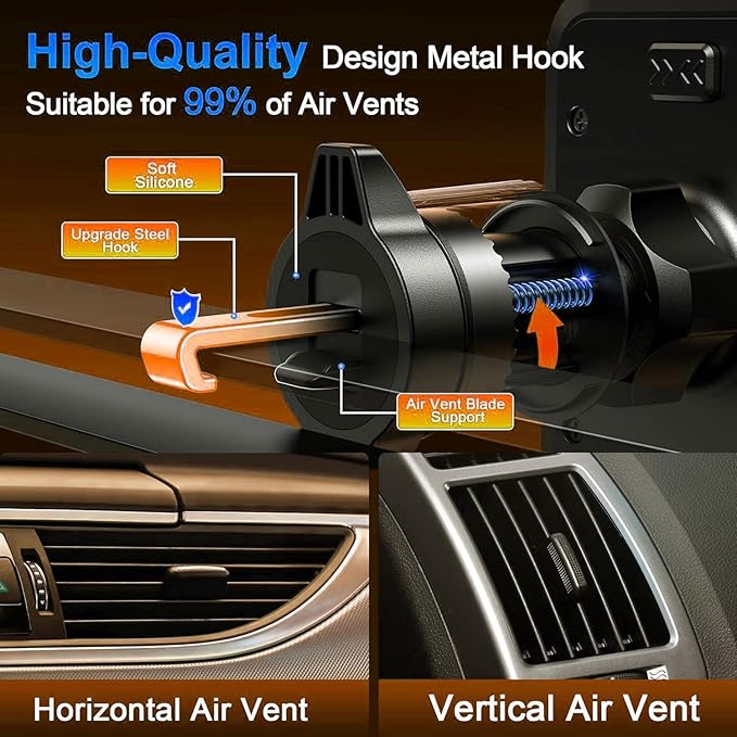 - NOTE: PHONE MOUNT ONLY CAN HOOK ON HORIZONTAL AIR VENT BUT IT CANNOT BE USED ON VERTICAL OR ROUND AIR VENT