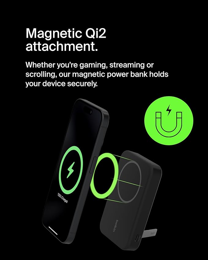 Belkin Portable Charger, Wireless Power Bank 15W 8000 mAh w/ Qi2 - MagSafe Charger w/Built-in Pop-up Kickstand - Compatible w/iPhone 17, Air, Pro, Pro Max, Google Pixel 10, etc. - Black