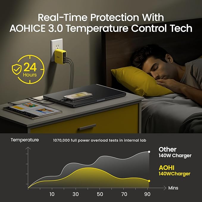 - Stronger Temperature Control Tech: Equipped with AOHi-ICE 2.0 technology, AOHi Youth 140W fast charger has passed 1,070,000 full power overload tests, supports high power output while real-time temperature control and rapid heat dissipation, safeguarding your devices from overheating
