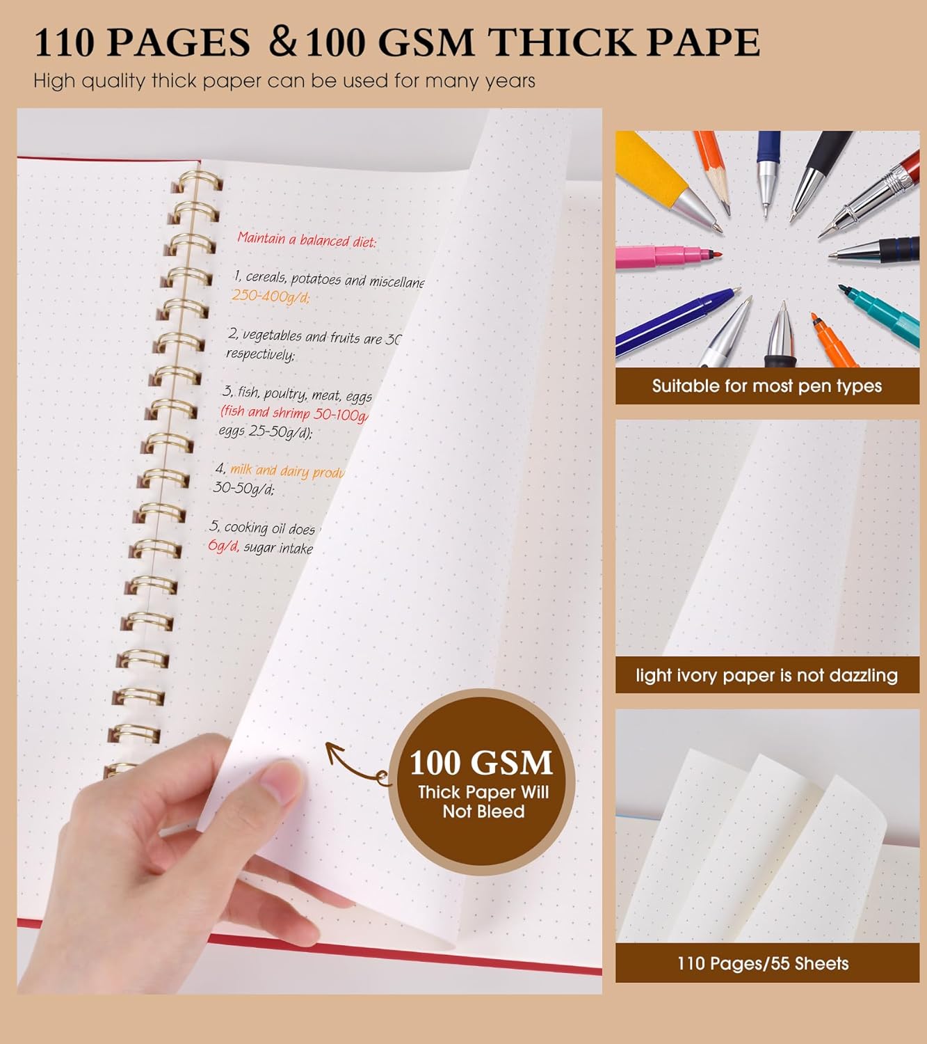 - 【100 GSM Ink-friendly Paper】 Our red spiral dot grid notebook pages are very thick, which avoids ink bleeding through and ghosting. Suitable for most pen types, such as ballpoint pens, fountain pens. Each dotted journal 55 sheets/110 pages, offering enough space to write in. Allowing you to write on both sides of every page to maximize your usable space. light ivory paper is not dazzling, let you have a comfortable writing experience.