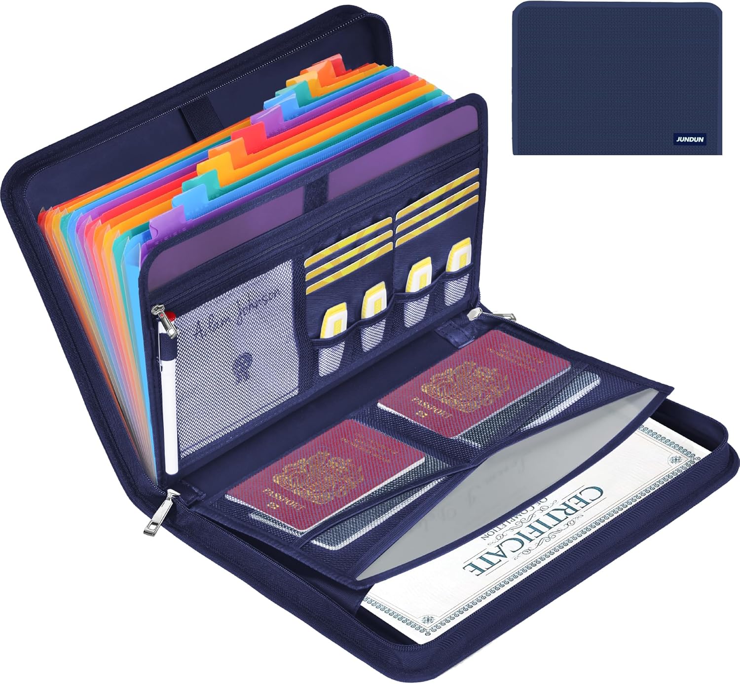 - ENHANCED DESIGN: Bid farewell to messy documents and chaos with JUNDUN file organizer folders. Our innovative design lets you methodically arrange and categorize letter/A4 files, receipts, cards, USB drives, pens, passports, and more. With our expanding file folder, a single unit is all you require to manage your entire file spectrum, preserving your time and resources. Streamline your life and maintain orderliness effortlessly with our budget-friendly resolution
