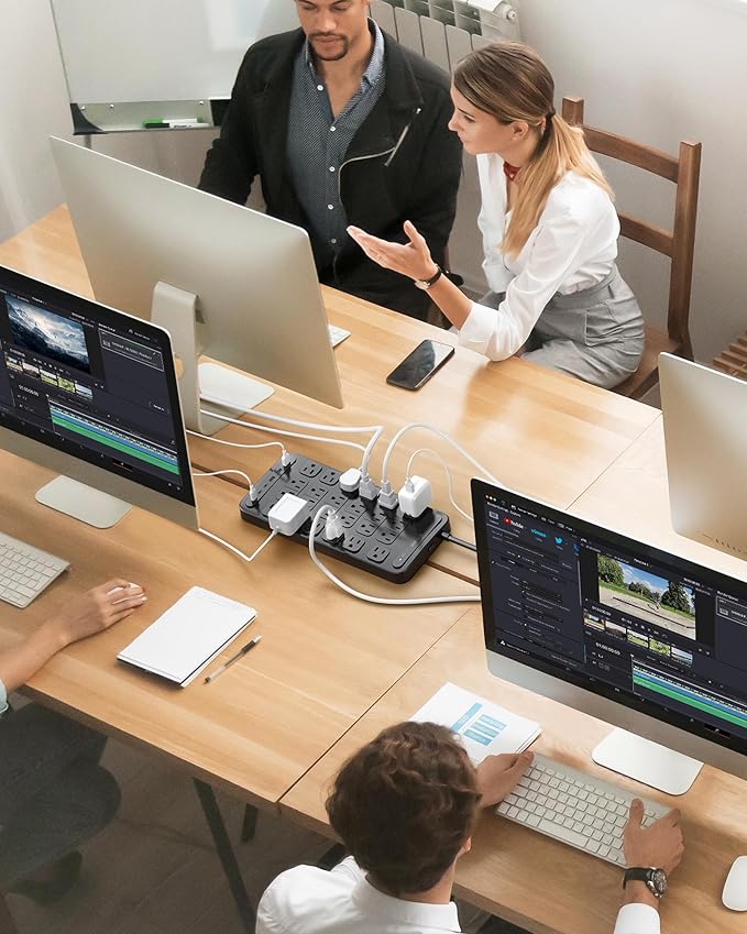 - 30-in-1 Power Strip with USB Ports: This versatile power strip features 24 AC outlets and 3 USB-A & 3 USB-C ports, with the USB-C ports supporting 20W fast charging. It supports 1875W/15A and universal voltages (100V-250V), and its spacious layout accommodates bulky adapters side by side, making it ideal for extensive setups like gaming stations, media centers, or home offices.