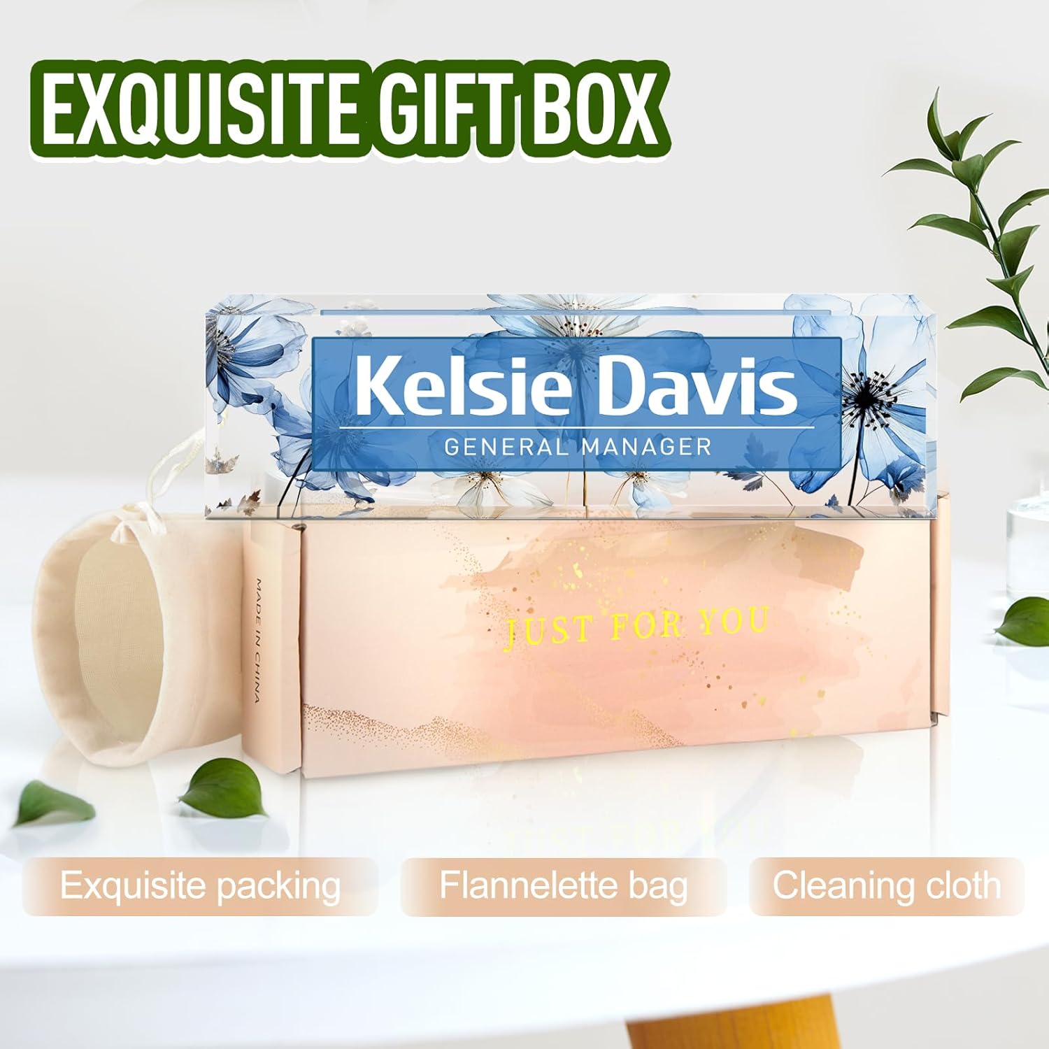 - 🎆【Personalize Your Unique Acrylic Name Plate】 Click The "customize Now" Button And Choose Your Desk Plaque Style And Font. Then Enter Your Custom Message. Please Make Sure All Text Is Correct. We will Print your name plate Design on our acrylic glass block which create a mesmerizing piece you could not take your eyes off. It will also win you over from your colleagues