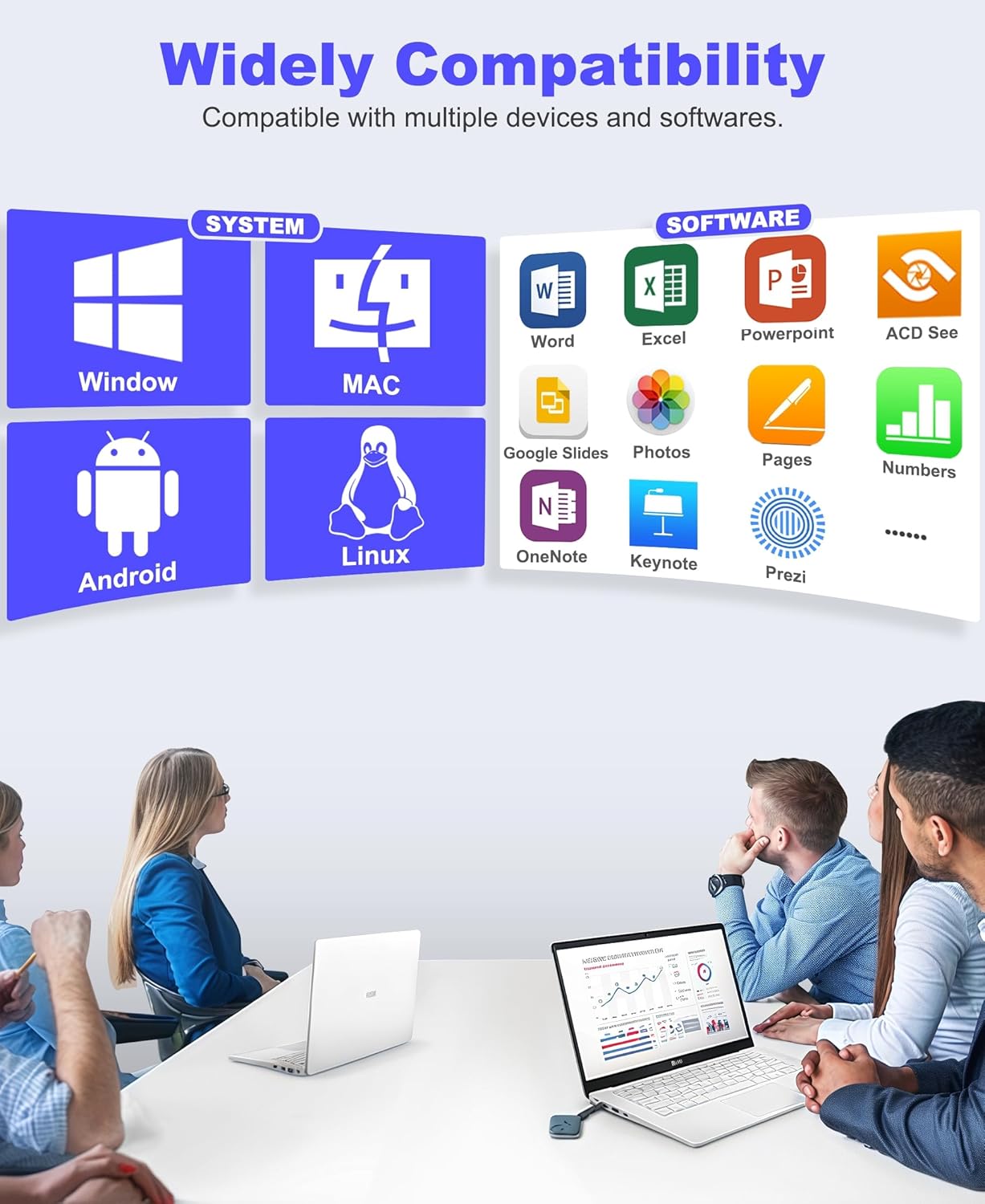 - 【LONG RANGE WIRELESS & ADJUSTABLE BRIGHTNESS】Enjoy plug-and-play simplicity with no setup required for the slide clicker. Features a wireless range up to 100FT and a light range up to 656FT. Utilizing 2.4GHz wireless radio frequency technology ensures high sensitivity and minimal interference. The wireless presentation clicker offers 3 adjustable brightness levels to suit various lighting conditions
