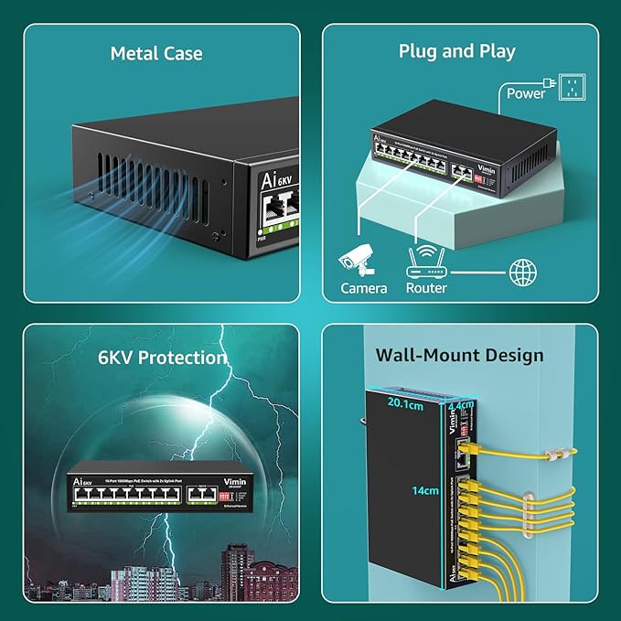 - ๐Robust Protection - The VIMIN PoE Ethernet switch hub is equipped with 4KV lightning protection, safeguarding both the switch and connected devices against voltage spikes. This feature ensures reliable and uninterrupted network performance, even in challenging environments.