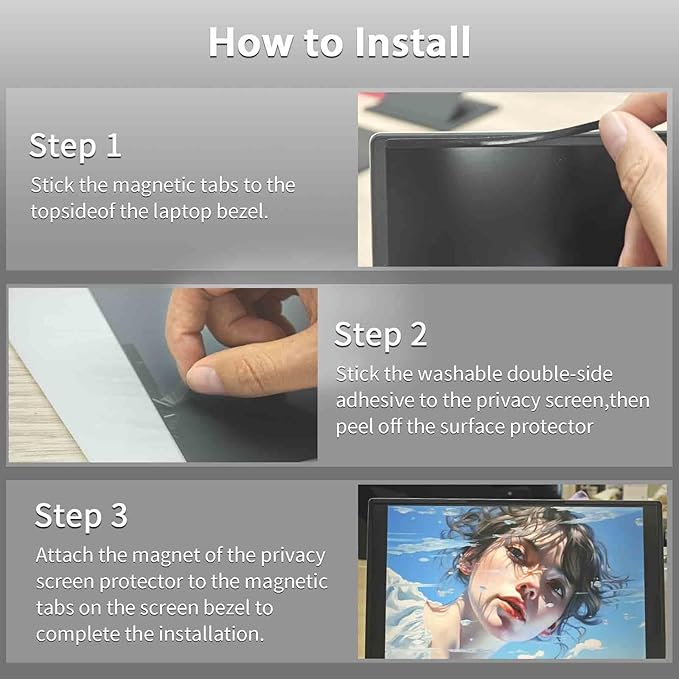 - [Removable Magnetic Laptop privacy screen] Laptop privacy screen adopt detachable magnetic design,Easy to install and detachable,switch between anti-peep and original screen vision at any time. we also provide screen protector storage folder for laptop privacy filter,which can be easy to carry and use at any time.[13.3 inch laptop privacy screens-16:9 is suitable for a variety of public places, business meetings, open-style offices, financial institutions, cafes, airplanes, trains etc.]