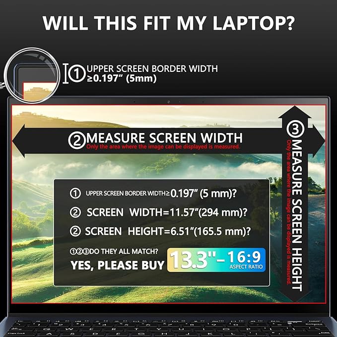 - [Please Measure Length & Width] FILMEXT Magnetic privacy filter for laptop 13.3 inch 16:9-ratio , WIDTH: 11 9/16" (294 mm ), HEIGHT: 6 1/2"(166 mm), Diagonal: 13.3 inch 16:9 ratio (universal-13.3"16:9, Not for MacBook or TouchScreen, ❤Do not fit for Think Pad❤) Please confirm width and height for your laptop screen before ordering and feel free to contact us if you have any questions about the size.