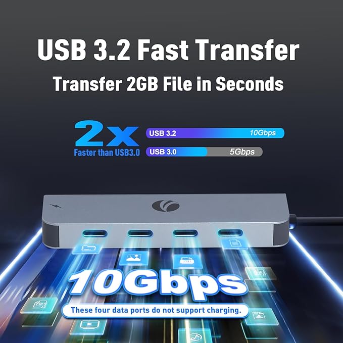 - 【10Gbps Data Transfer】USB C splitter move files to and from your laptop at speeds of up to 10 Gbps via the USB-C data ports. That’s fast enough to transfer a 20 GB file in just 16.4 seconds. We recommend connecting one or 2 external USB hard drive, SSD drives at a time.