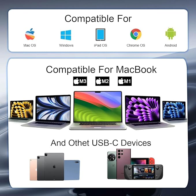 - 【Plug & Play】The usb c hub multiport adapter comes with 60cm cable, meeting many practical scenarios. It can be connected to laptops, mobile phones, tablets, etc. The Type C splitter is compatible with all devices with USB-C port, and support OTG, no additional drivers are needed. Compatible with M2/M1 MacBook Pro, Mac OS, M2/ M1 iPad Pro, M2/M1 MacBook Air, iMac, Dell, HP, Samsung, Windows, Windows, Android and more.