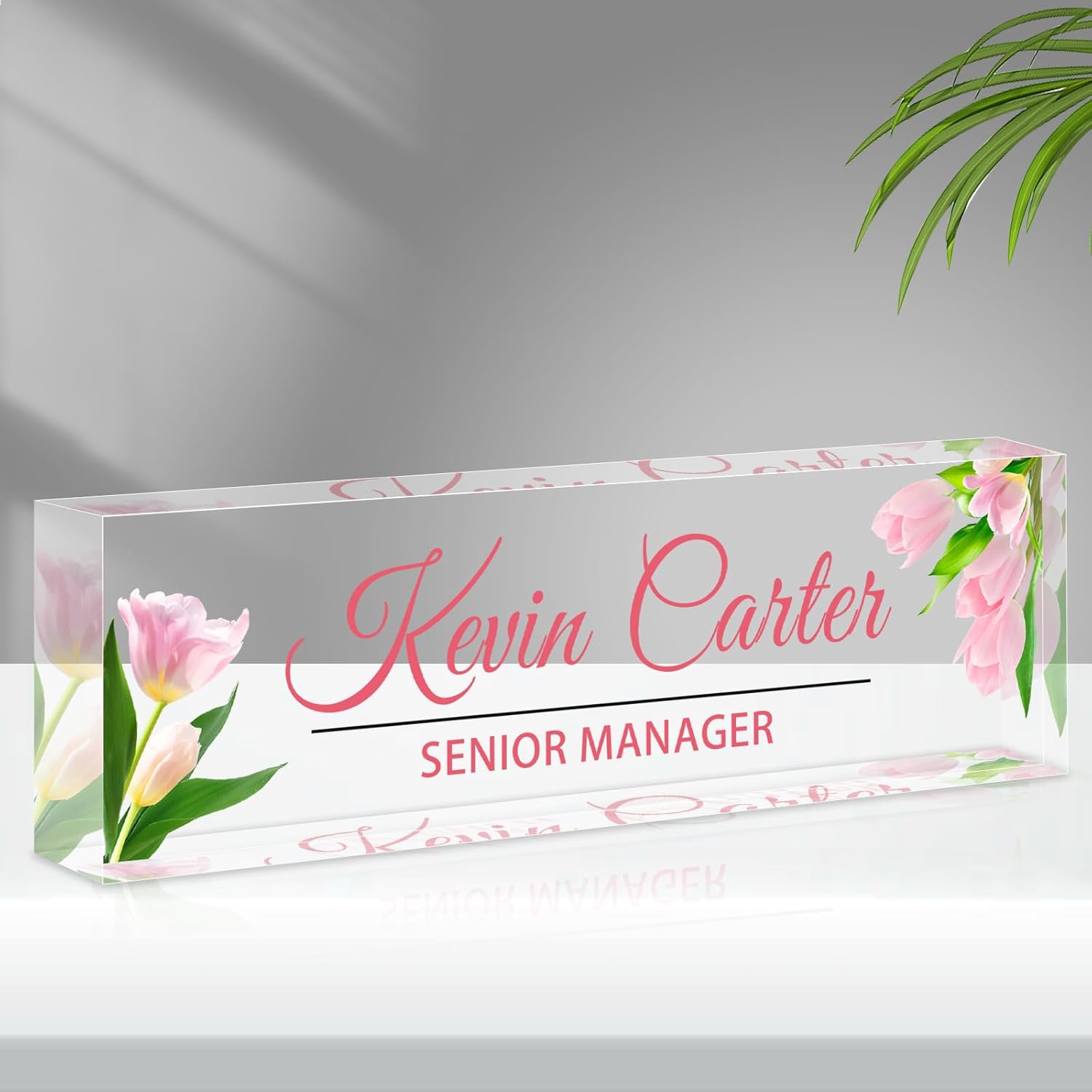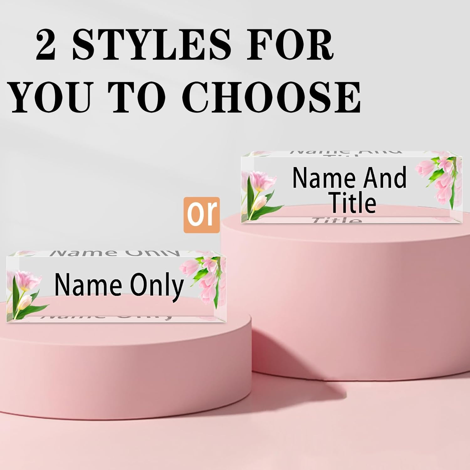 Name Plate for Desk Personalized, Acrylic Desk Decorations, Employee Appreciation Gifts, Custom Office Gifts for Coworkers, Boss, Teacher, Nurse (Pink Tulips)