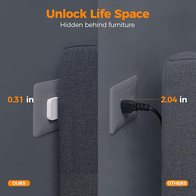 - Flat Plug Power Strip: With only 0.31 in ultra thin flat head design, 10 foot power strip long cord can easily fit in tight spots and hide behind sofa, bed or other furniture, sitting flush against the wall, keeping your house very clean and tidy; 45 degrees right angle design creates an extra space for other plug without any blocking