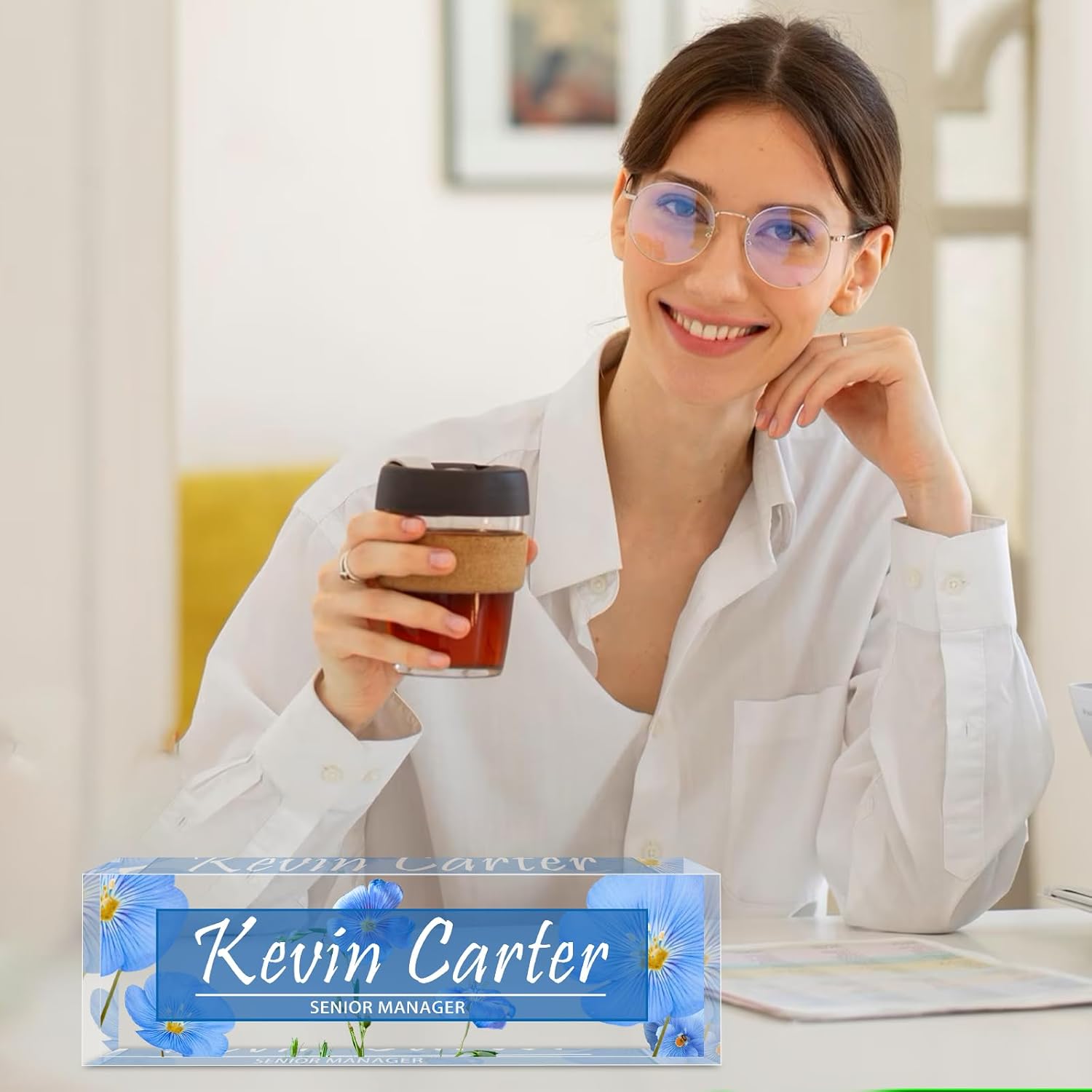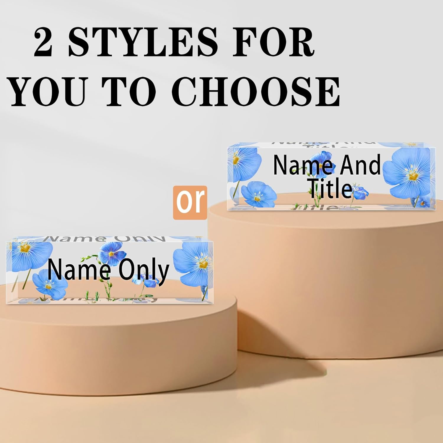 Name Plate for Desk Personalized, Acrylic Desk Decorations, Employee Appreciation Gifts, Custom Office Gifts for Coworkers, Boss, Teacher, Nurse (Blue Flowers)