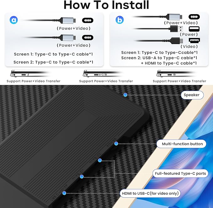 - 【Plug and Play, No Driver Required】This is a triple laptop screen extender for 13"-17.3" laptops, whether you choose a USB-C, USB-A or HDMI connection, simply plug in the laptop screen extender and start your daily use without drivers. (Please note: When using the HDMI cable, connect an additional USB-A to USB-C cable on the same screen extender for power supply)