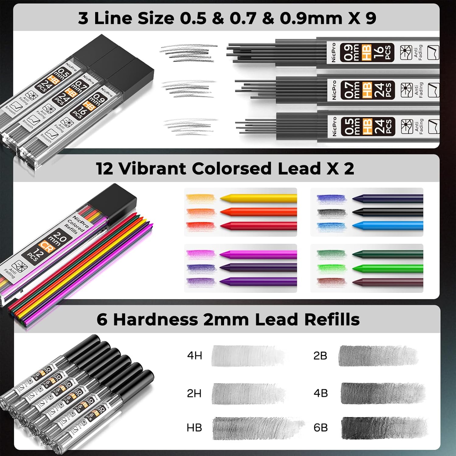 - Mechanical Pencil Drawing Set – Come with 6pcs full metal mechanical pencils and 2 pcs 2mm lead holder, 20 tubes of lead refill including 9 tube of HB lead refills in 0.5mm & 0.7mm & 0.9mm , 9 tube of 2mm (4H 2H HB 2B 4B 6B) graphite lead refills and 2 tube of colors lead refills, 3 pcs 4B erasers, 1 pcs kneaded eraser, 18 pcs cap eraser refills, 2 pcs lead sharpeners,all in a protective storage case.