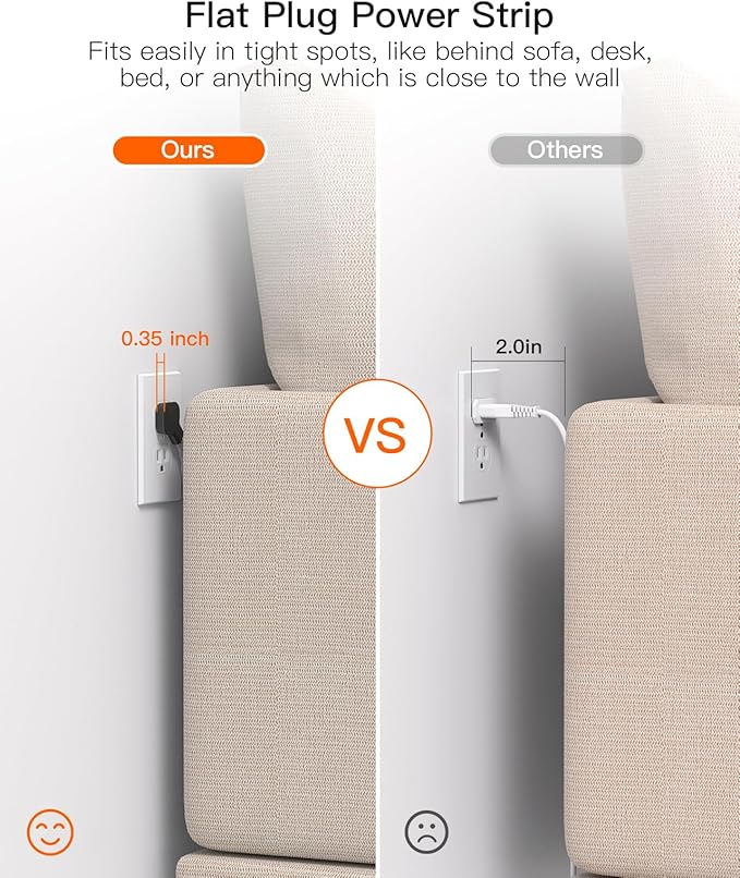 - 【Thin Flat Plug & 5Ft Extension Cord】With only 0.35 inch ultra thin plug and 45° right angle design, the flat plug power strip is much thinner than traditional plugs, which can close to the wall easily, and hide in the back of furniture, bed or refrigerator; 5ft extension cord is made of pure copper, which has better current carrying capacity (15A). The braided power cord is not easy to deform, is durable, and more safety.