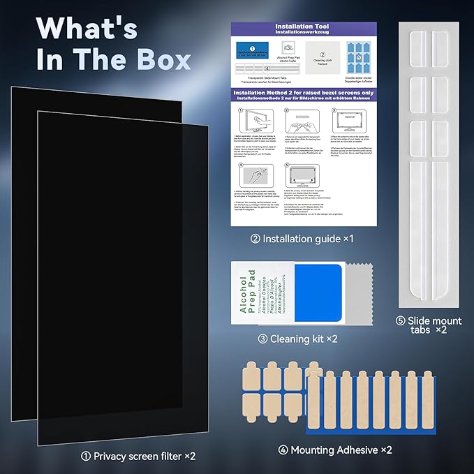 - 【Package Content】You can get 2pcs 19 inch computer monitor privacy screen filter for a better price! Each package includes 19 inch privacy screen film x1, adhesive strips x2, slide mount tabs x2, alcohol x2, cleaning cloth x2. We are a factory that integrates production, processing and sales, We guarantee that all of our products are premium privacy screen protector. If anything happens, we will send you a new 19 inch monitor privacy screen at absolutely no cost. So you can buy with confidence!