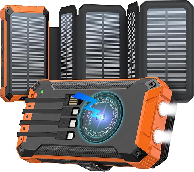 GOODaaa Power Bank Wireless Charger 36800mAh Solar Charger with Five Solar Panels Built-in Four Cable Five Outputs Portable Power Bank for Cell Phone with Dual Flashlights, Carabiner