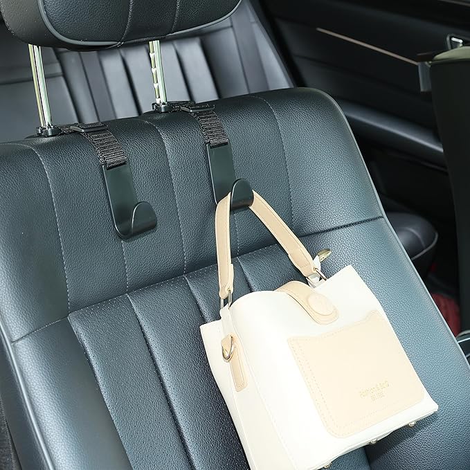 - SECURE AND HANDY: You will no longer have to put the stuff on the floor or the seat. The headrest hooks keep your bags/water bottles away from falling off at driving trip, and keep the belongings at reach.