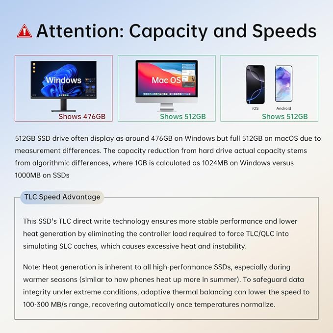 - Capacity Reminder: Display capacity of 512GB external ssd often appears as around 476GB on Windows. MacOS typically shows full 512GB. This display capacity reduction of 7% to 10% from flash drive actual capacity is from algorithms differences in which 1GB is interpreted as 1024MB on Windows and 1000MB on SSDs