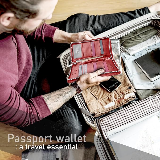 - TRAVEL-READY - This snazzy passport holder travel wallet keeps your documents organized and secure on the go. It offers ample space with slots for 4 passports, 4 cards, 2 extra pockets for money and tickets, a memory card slot, and window ID pockets. The zippered closure keeps everything neatly contained in this versatile travel document organizer, perfect for families.