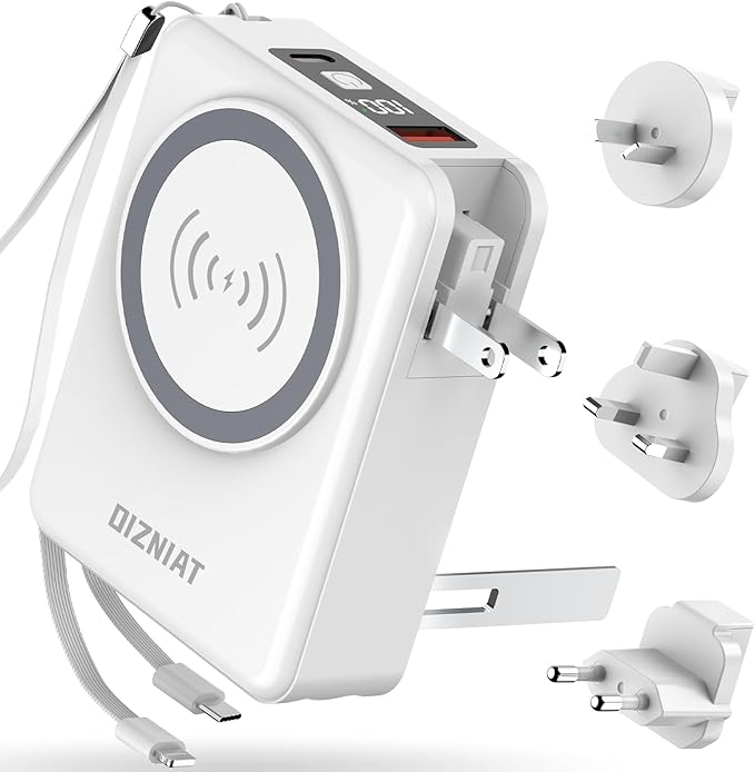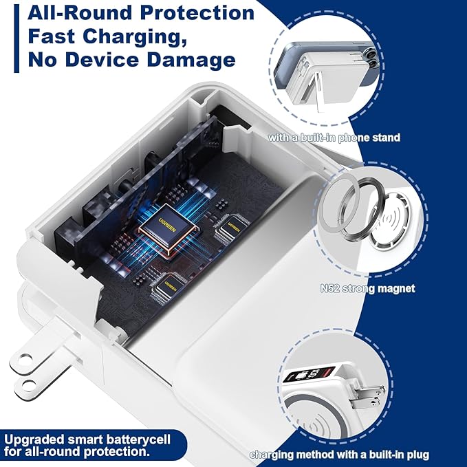 - ALL IN ONE CHARGING HUB: This portable charger Built-in cable - Type-C & Lightning cable eliminate carrying extra wires—directly charge iPhones, iPads, AirPods, andriod android phones instantly. Equipped with 5 output ports and 2 input methods, It supports both built-in plug charging, cable charging and wireless magnetic charging, offering flexibility and convenience in charging.This portable charger power bank with the ability to charge up to 5 devices simultaneously, you and your travel companions can stay powered up without fighting over outlets.