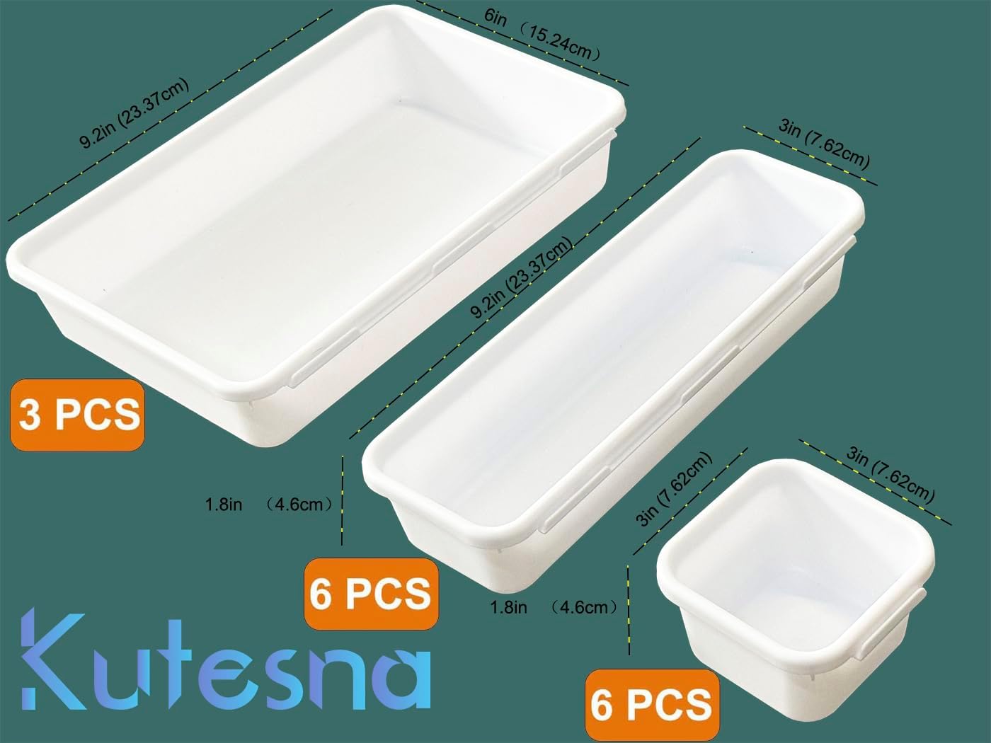 - 【MULTI-PURPOSE STORAGE】15 Pcs customizable drawer bins include 3 large,6 medium and 6 small trays.It’s easy to find a configuration that works for your drawers or desktop.You could use them in bathroom,office,dorm room and more.