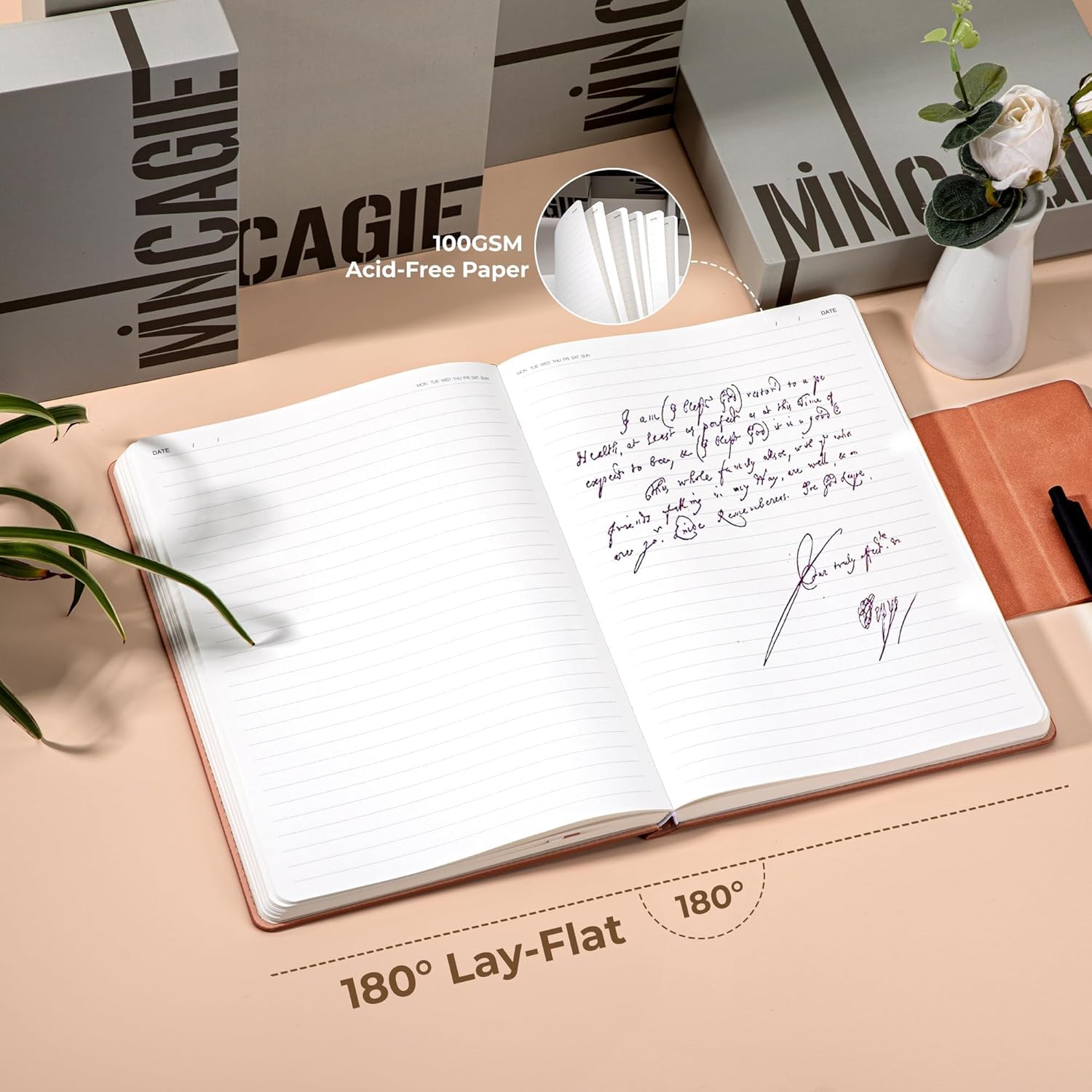 - Sleek Functionality: A magnetic square closure replaces traditional straps, ensuring secure closure and doubling as a hidden pen loop. Perfect for on-the-go use with its B5 large notebook size and 180° flat-lay design.
