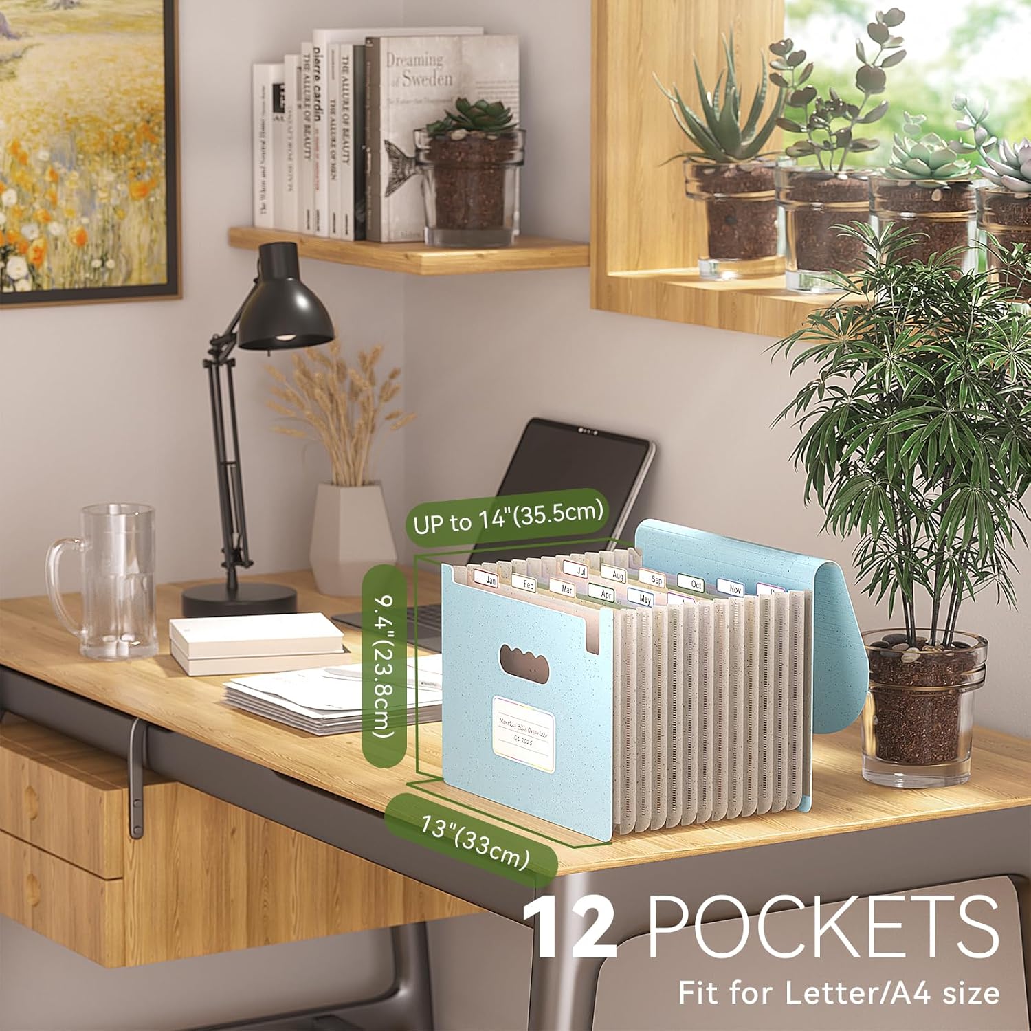 Accordion File Organizer, 13 Pockets Wheat Straw Expanding File Folder, Portable Monthly Paper Bill Tax Receipt Organizer, Letter A4 Size Document Holder with Colorful Tab - Sky Blue