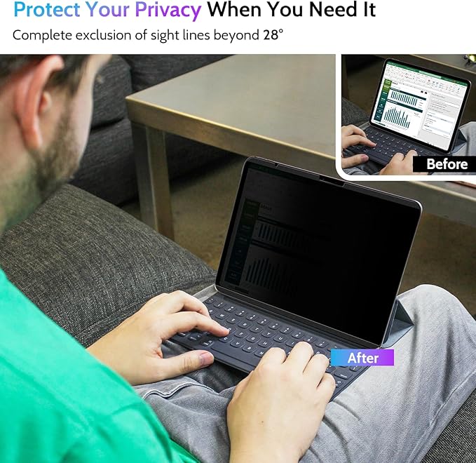 - 【28 ° TRUE ANTI-PEEP】Thanks to Peslv's self-developed, leading-edge anti-peep technology, The iPad air 13 inch privacy screen protector can ensure that the contents of the iPad screen are invisible to the line of sight beyond 28 degrees. protect your iPad screen privacy, so you don't have to worry about information leakage in public. Note: This style only supports horizontal anti-peep, and does not support vertical anti-peep.