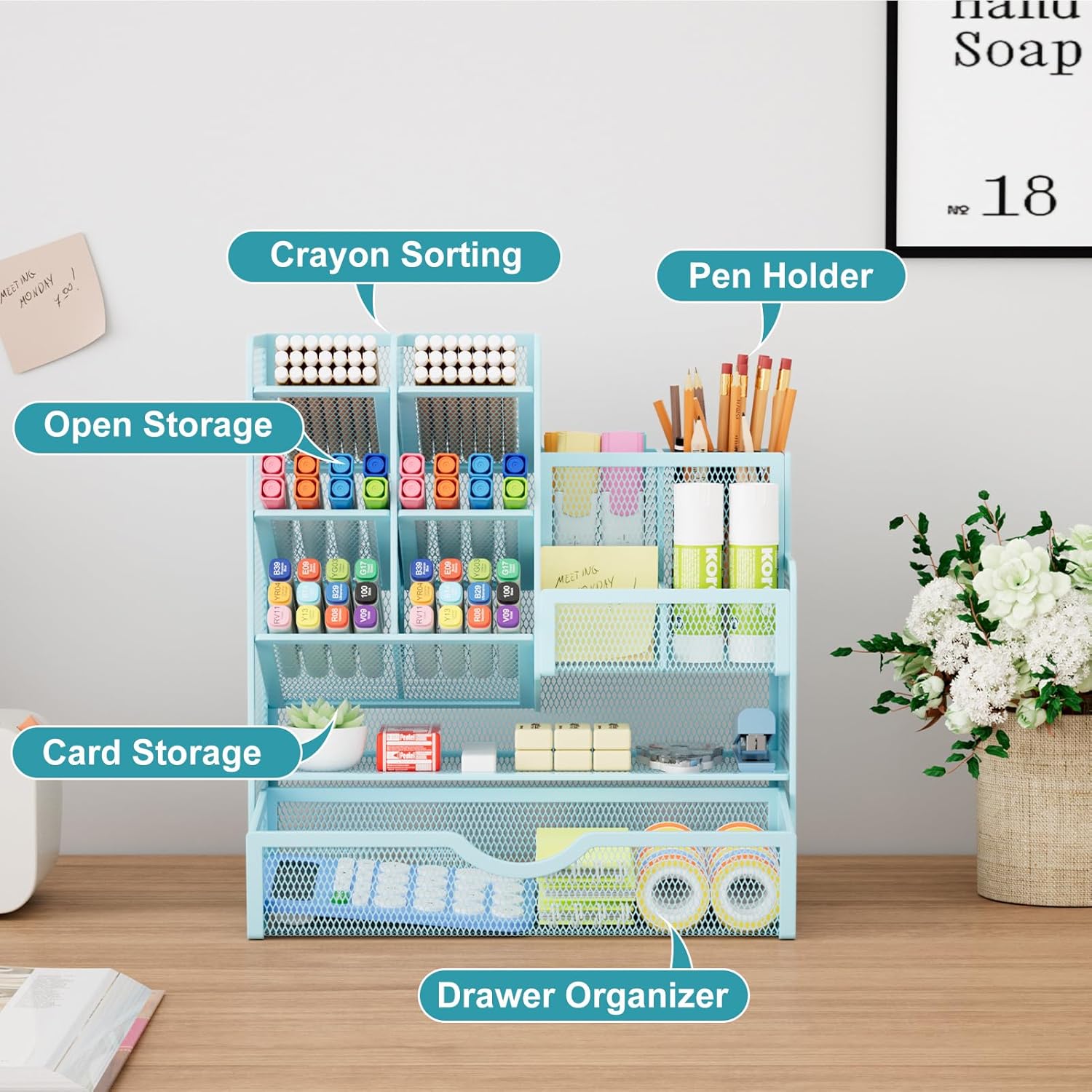 Marbrasse Mesh Pen Holder for Desk, Multi-Functional Pencil Organizer with Drawer, Desk Organizers and Accessories for Office Art Supplies (Blue)