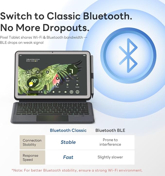 - ☝️Due to a recent Android update, some Bluetooth issues may occur. The Pixel Tablet shares bandwidth between Bluetooth and Wi-Fi. If encountering Bluetooth connection issue, try improving your Wi-Fi signal or turning off Wi-Fi. *Note: Starting May 8, 2025, we will switch from BLE to classic Bluetooth to ensure a more stable connection.