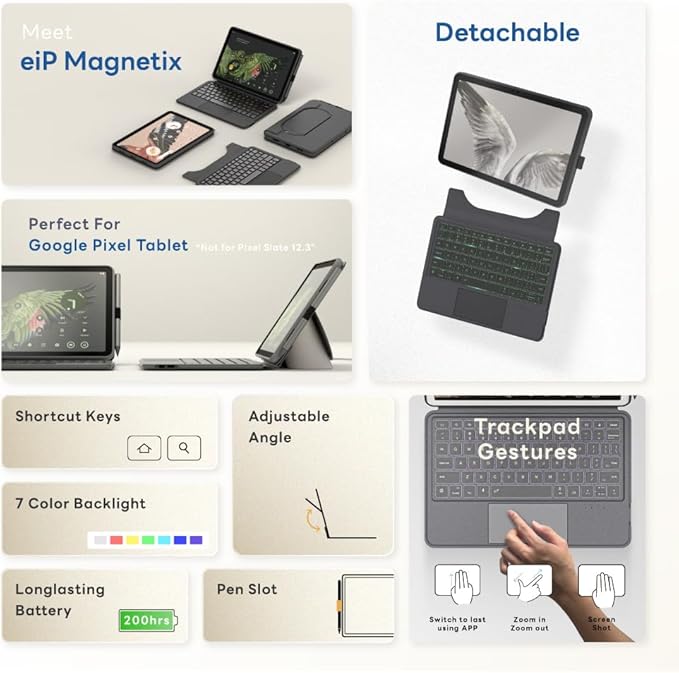 - 🧲【Magnetic detachable keyboard】- eiP Magnetix keyboard case securely attaches to the protective case using a strong magnetic strip. You can detach and store the keyboard separately, leaving the case and back stand. This setup allows you to place the Pixel Tablet on your lap for reading, watching videos, or drawing. Switching between Tablet and Laptop modes becomes effortless.