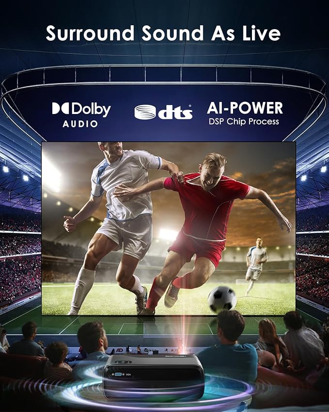 - [Blazing-Fast WiFi 6 & Smart Connectivity - Lag-Free Experience] Stream ultra-smooth 4K without buffering! WiFi 6 (3x faster than WiFi 5) ensures stable, high-speed connections. Dual-band 2.4G/5G and NFC enable effortless screen mirroring and phone control. Bidirectional Bluetooth 5.4 lets you connect wireless earbuds and speakers simultaneously for immersive sound or use the projector as a powerful Bluetooth speaker.