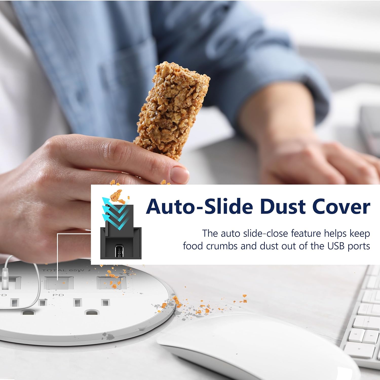 LIDER PD 65W GaN Technology Desktop Power Grommet, Power Delivery, USB-A and 2 USB-C Ports, Tamper-Resistant Receptacles, Self-Close Cover, Desk Charging Station, White, 6.5ft Cord, ETL Listed