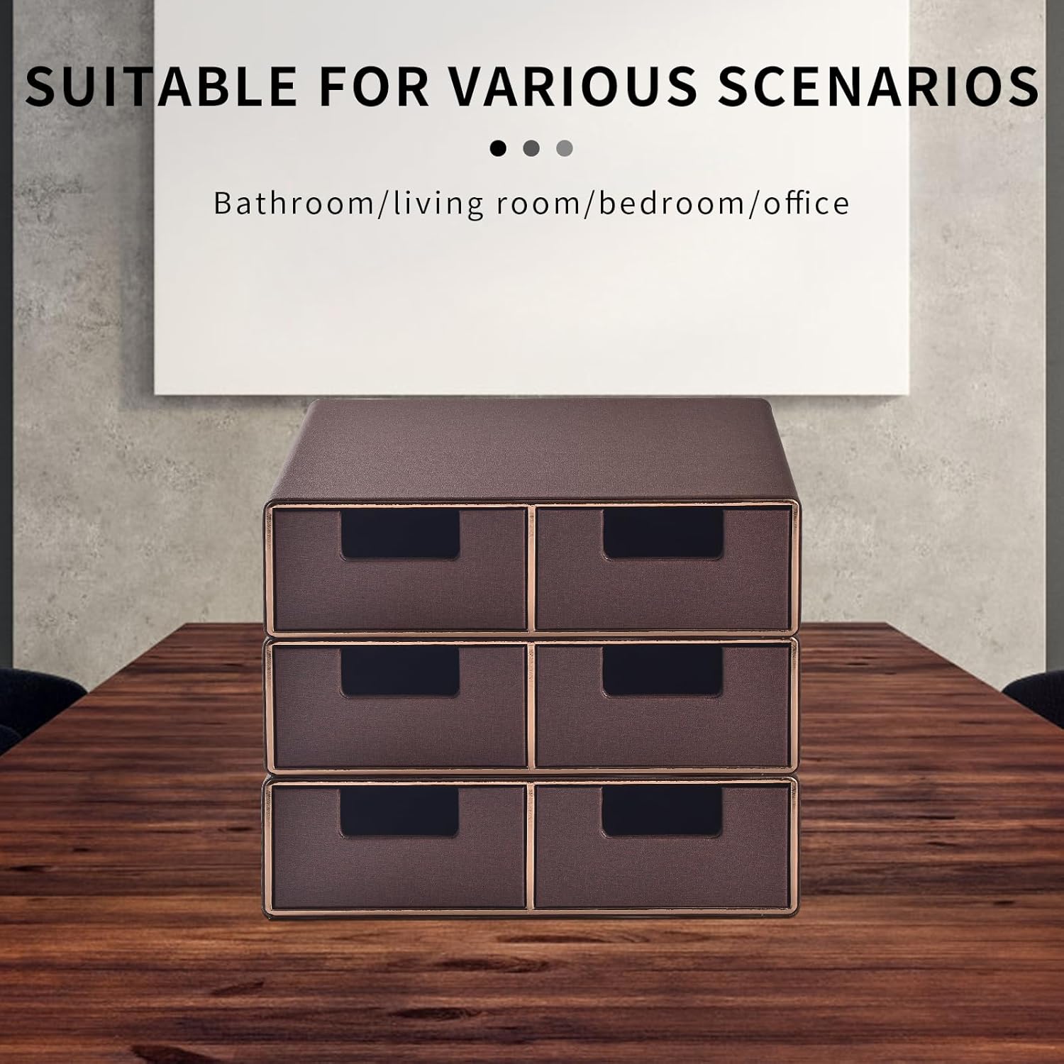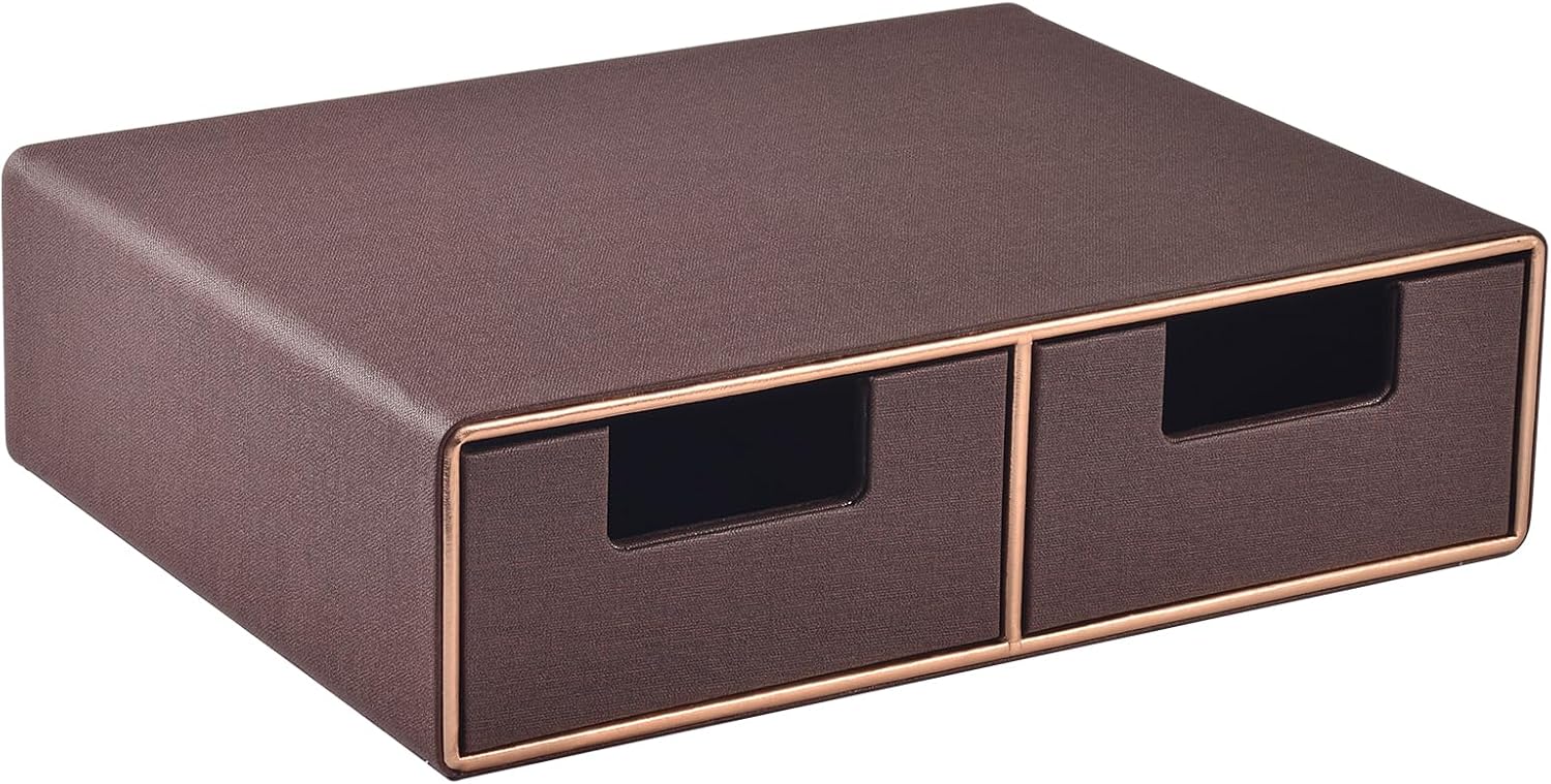 Linen Leather Desk Organizer and monitor stand with Drawers-Mini Desktop Drawer Organizer Stackable-Tabletop Organization Storage Box for Office Supplies Home Vanity Toiletries (Brown, 2-drawers)