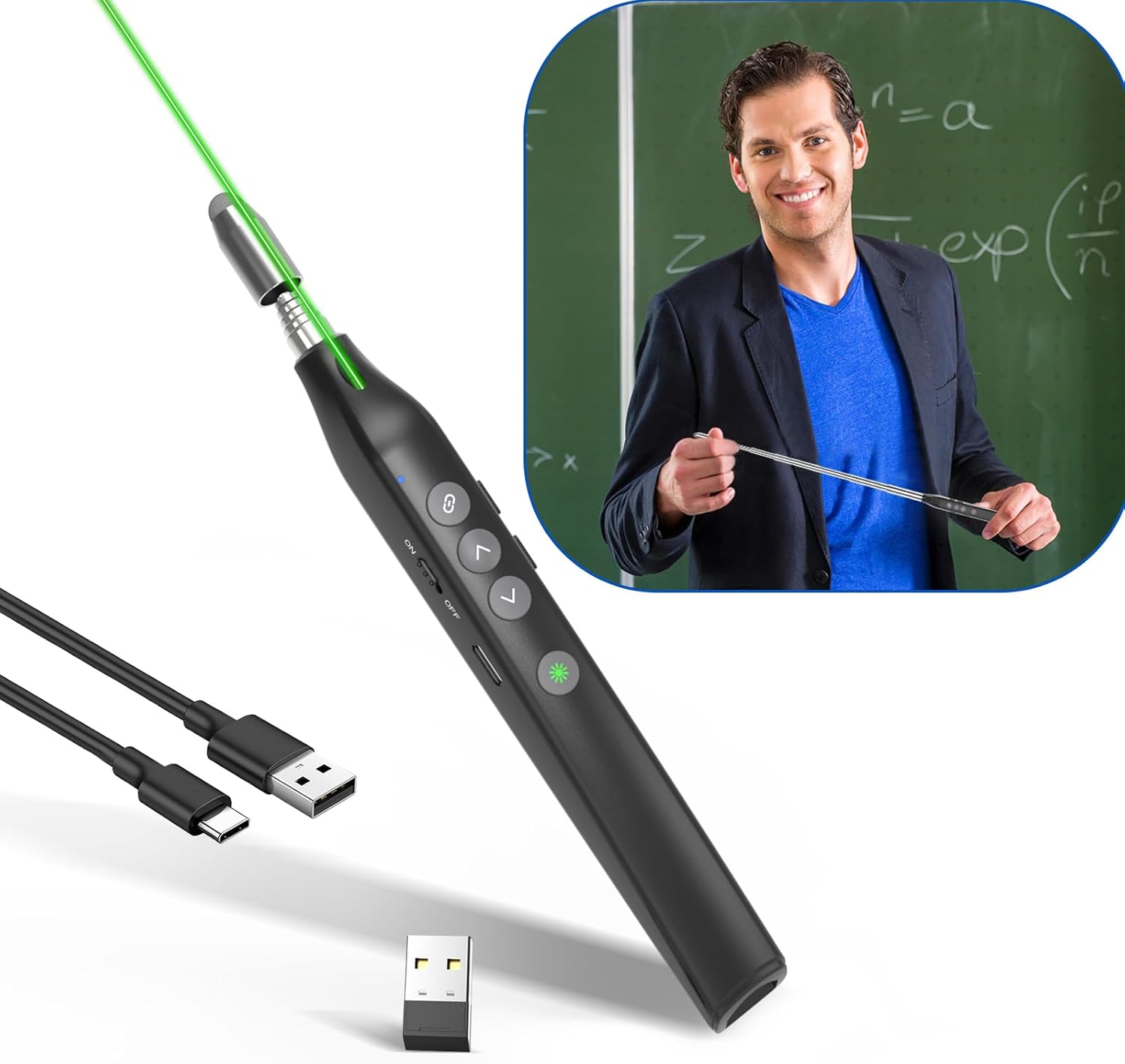 - [Wireless Presentation Clicker & Laser Pointer]This is a clicker for powerpoint presentations with a very bright green laser pointer. You can change your PPT/ Google slide from anywhere in the room, while pointing the specific parts of the slide by laser. PowerPoint clicker controls range:98FT/30M, laser pointer range: 328FT/100M.
