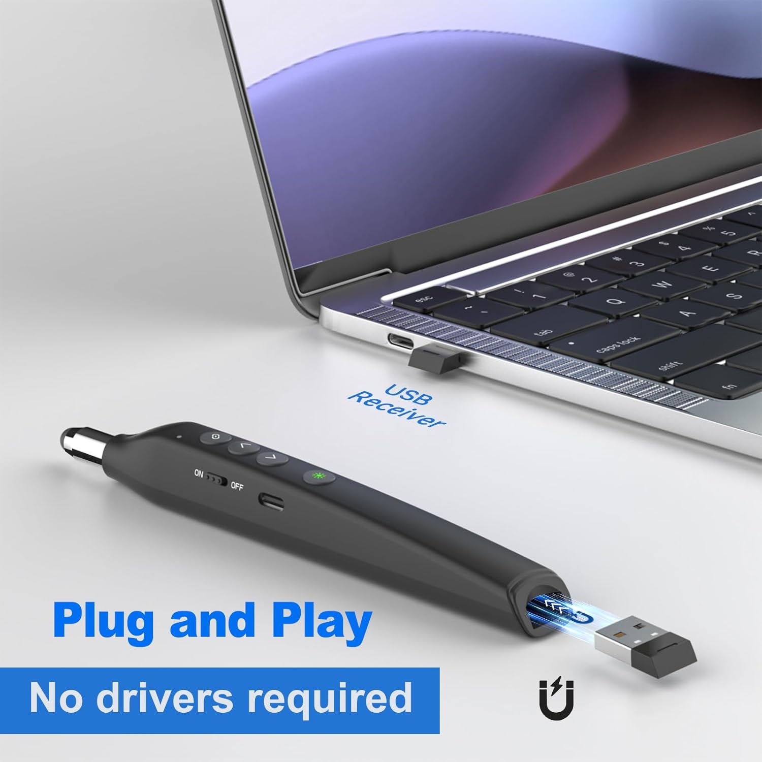 - [Easy to Use]No drivers required. Just plug into the USB dongle,then start clicking. Supports systems: Windows 2003, XP, Vista, 7, 8, 10, Mac OS, Linux; supports softwares: Keynote, Google Slides, MS Word, Excel, PowerPoint, Website, PDF.It can also be used as a promethean board pen effectively point out key information when presenting or teaching.