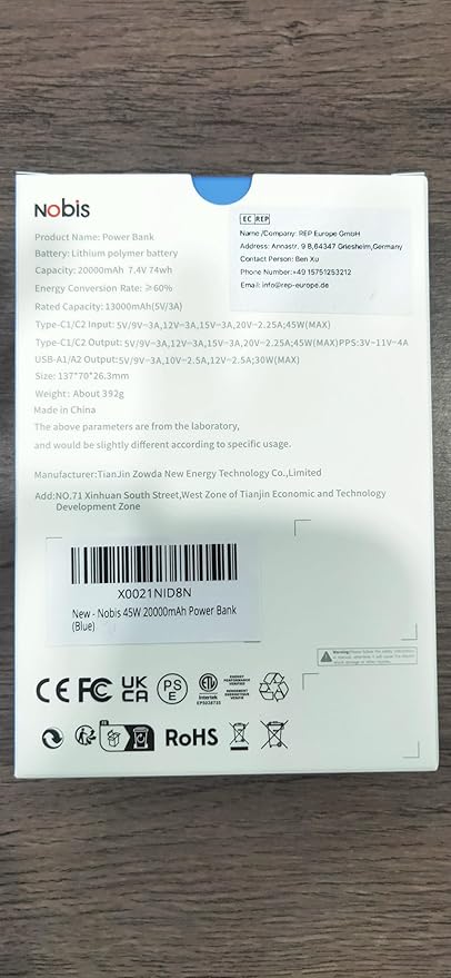NOBIS Portable Charger, 20000mAh Power Bank, 45W Power Bank Fast Charging, Battery Pack with C to C Cable, Battery Bank with Digital Display for iPhone Android Laptop etc(Blue)