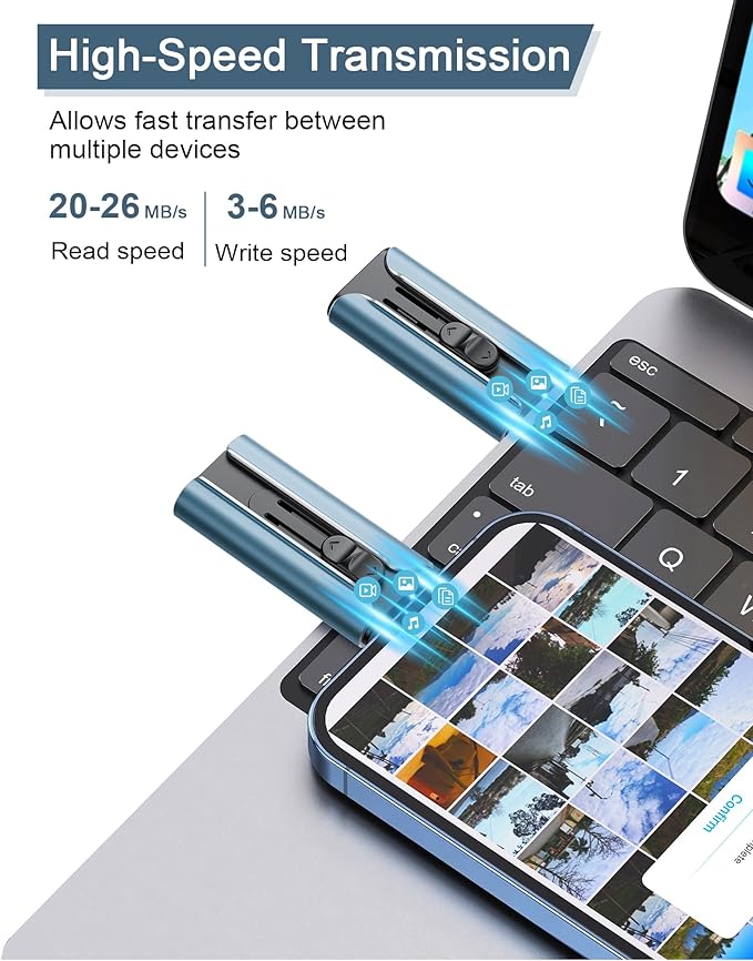 - 【High compatibility】: Our thumb drive is designed for use with a wide range of devices, including Phone 15, 15 Plus, 15 Pro, 15 Pro Max, Phone 14, 14 Pro, 14 Pro Max, 14 Plus, Phone 13, 13 Pro max, 13 Pro, 13 mini, 12 Pro max, 12 Pro, 12, 12 mini, 11 Pro max, 11 Pro, 11, XS MAX, XS, XR, X, 8, 7, 6, 6s, 5s (System Version 8.2 Or higher). The photo stick supports Android smartphones (Need to open OTG function). Our USB storage drives also support computers and other devices with USB ports.