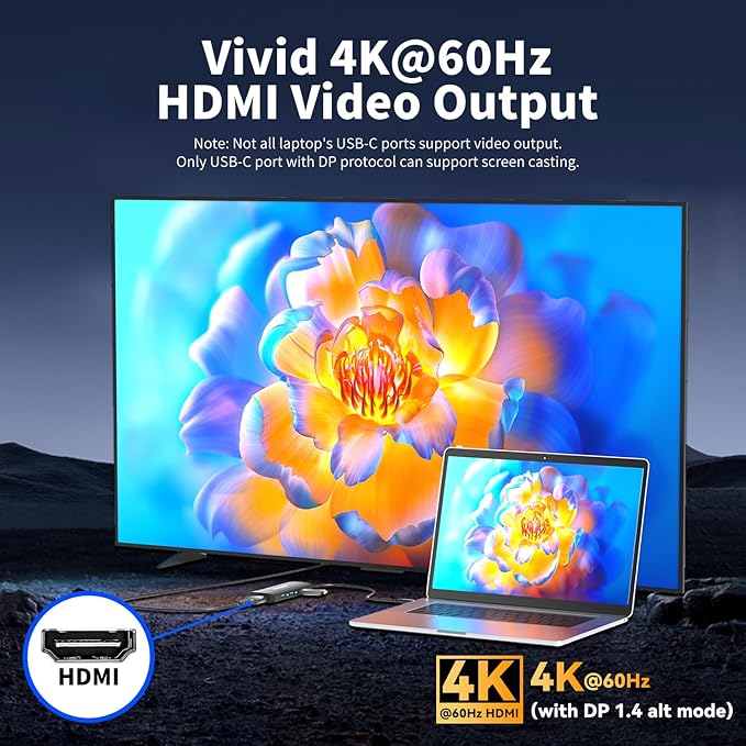 - 4K@60Hz HDMI: This USB C hub can mirror or extend your screen and streams 4K@60Hz UHD (3840x2160@60Hz), full HD 1080p or 3D video directly to your HDTV, monitor, or projector.