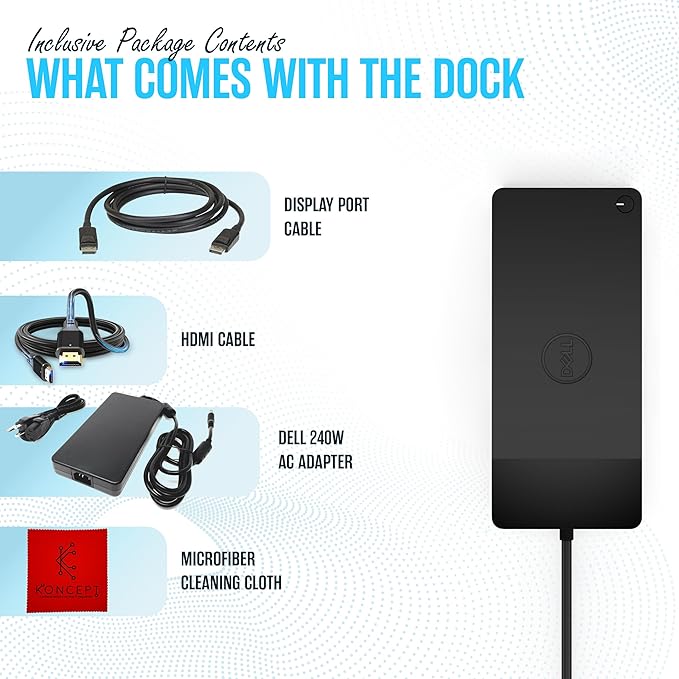 - [Package Includes] - Dock Station WD 19 DCS, Original Dell 240, 1x HDMI Cable, 1x Displayport Cable, Microfiber Cleaning Cloth.