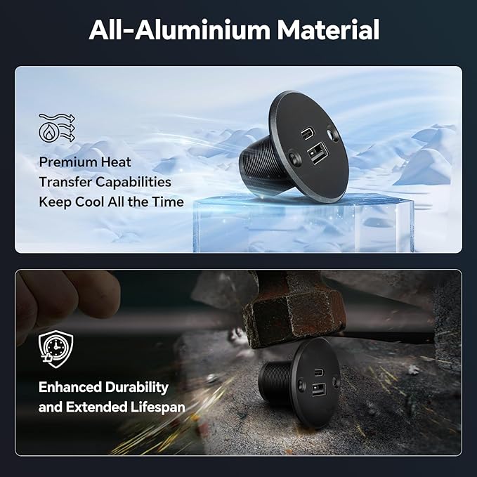 - Aluminum Construction & Safety: Crafted from robust aluminum, Acegoo's USB outlet excels in heat dissipation & durability. Integrated with smart protection chips & fuses, it safeguards your devices, enabling hassle-free travels