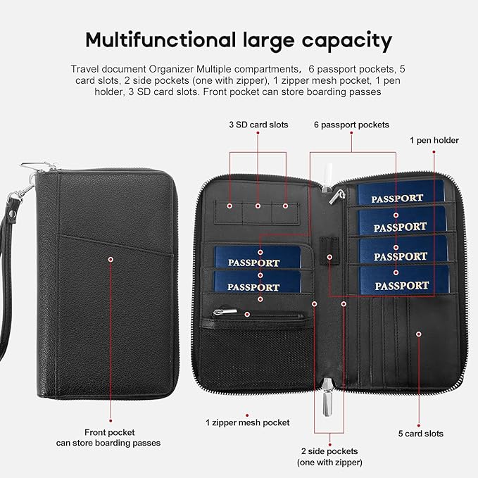 - 3.Travel document Organizer Multiple compartments๏ผ6 passport pockets, 5 card slots, 2 side pockets (one with zipper), 1 zipper mesh pocket, 1 pen holder, 3 SD card slots. Front pocket can store boarding passes