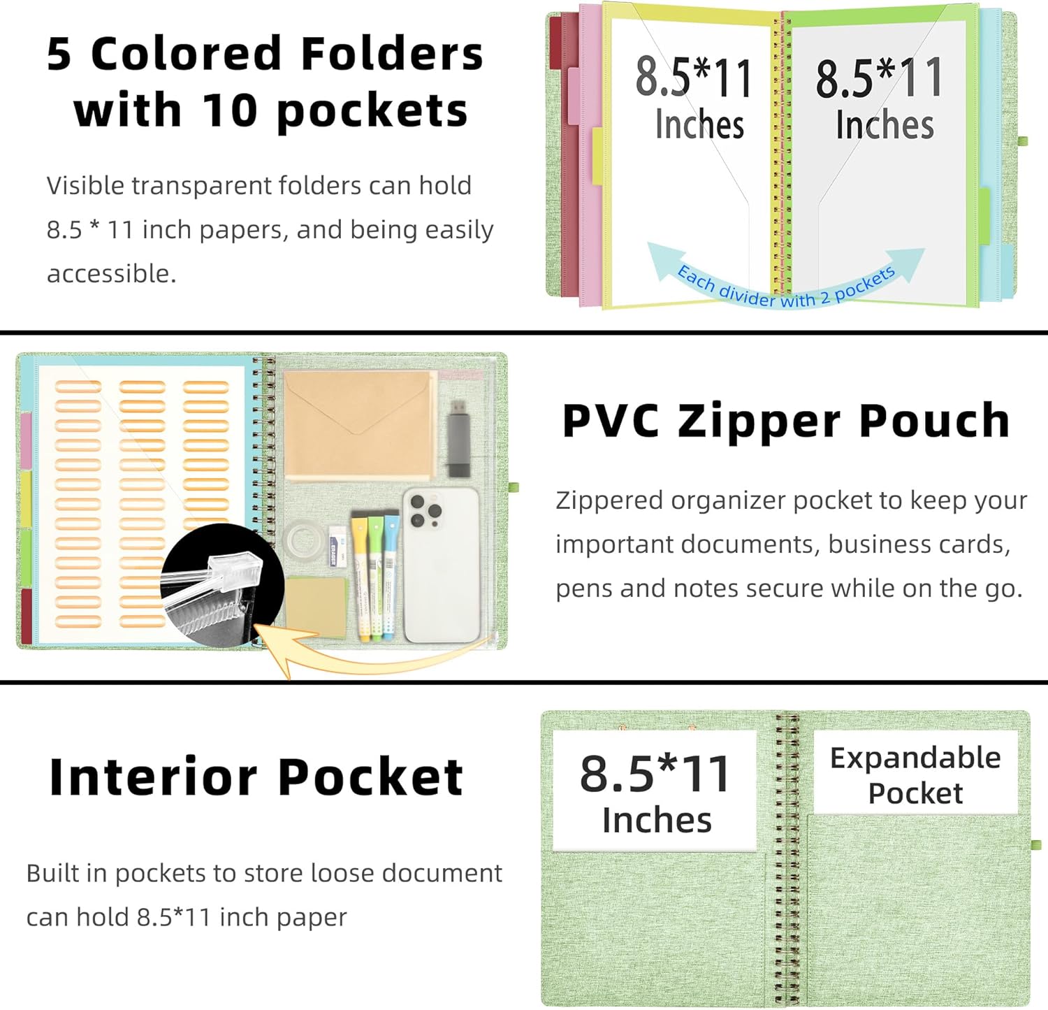 - 【Secure Storage】The portfolio organizer has a clear pouch with a zipper that provides a secure place to store documents, notes, or other items when you're on the go. The clipboard comes with 5 plastic folders that have 10 pockets, fitting all standard US letter-size sheets (11" x 8.5"). It is a great way to keep your papers organized and easily accessible.
